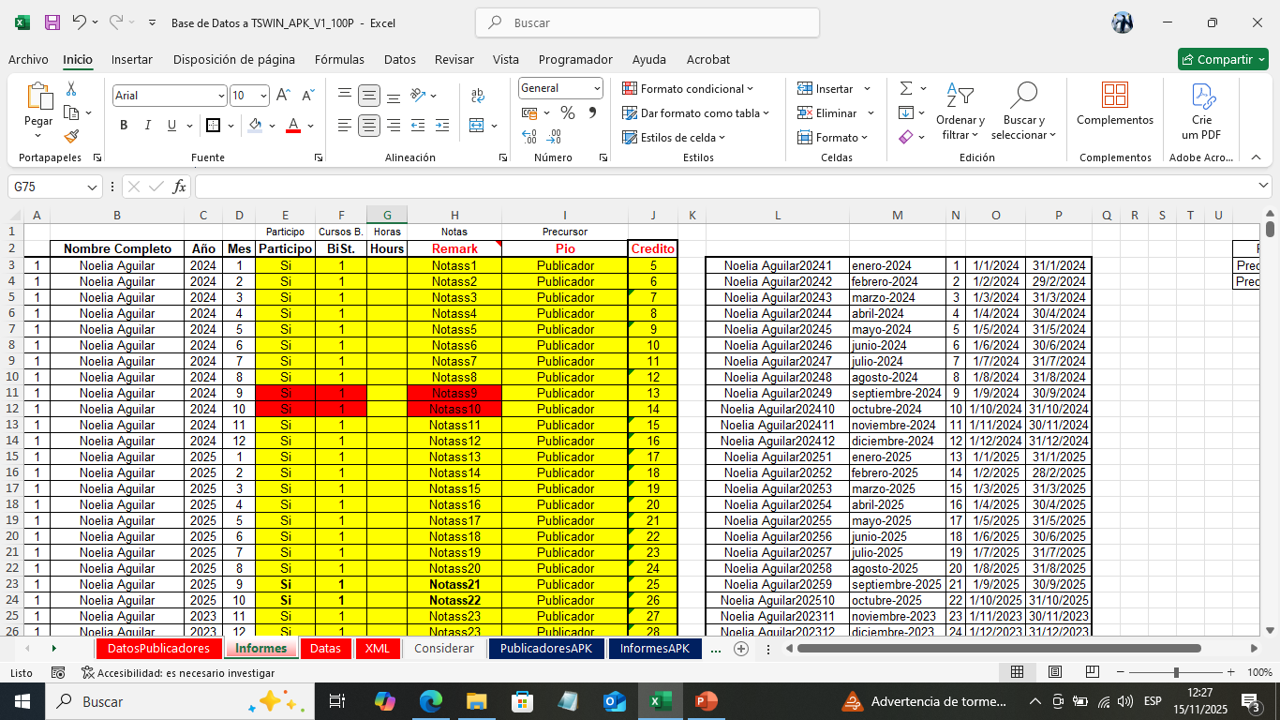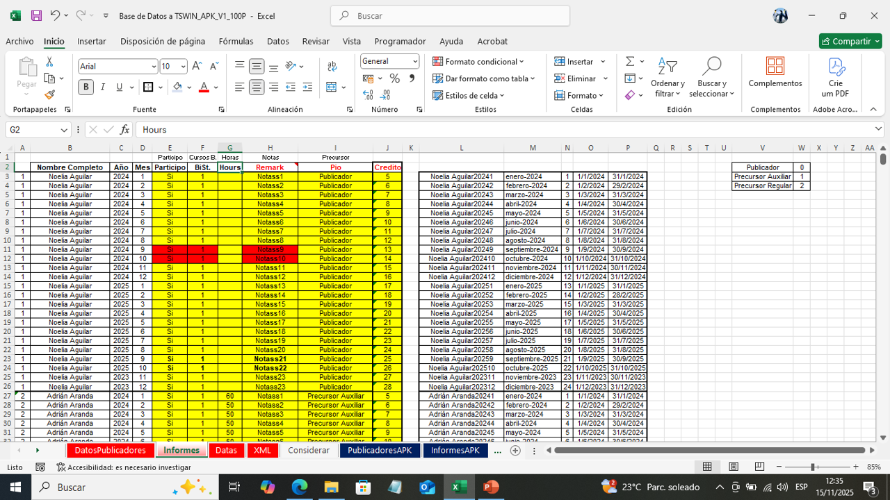 Agregar los datos de los publicadores en la Hoja DatosPublicadores. Como muestra la figura.