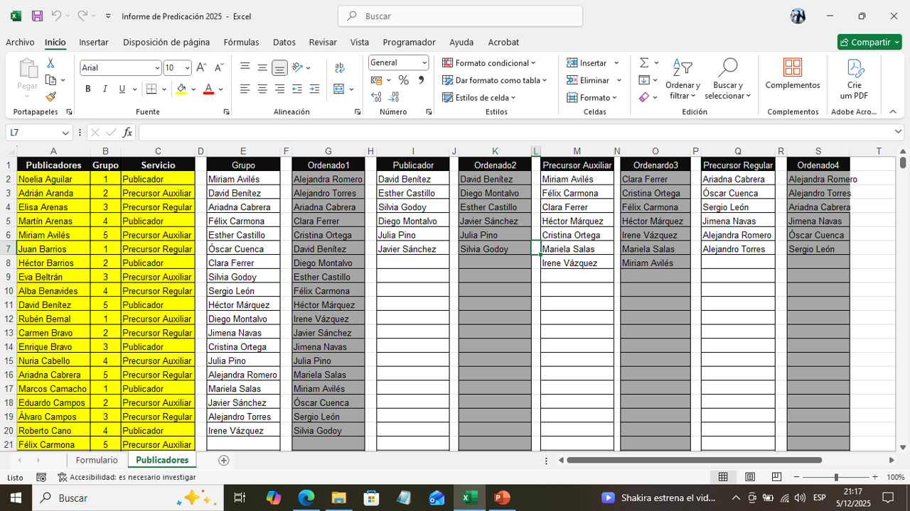 El secretario debe agregar la información de los publicadores de la congregación en la Hoja Publicadores (columnas: Publicadores, Grupo y Servicio). Automaticamente, el archivo va hacer los filtros por el grupo que se coloque en la Hoja Formulario (Grupo | Ordenado1; Publicador | Ordenado2; Precursor Auxiliar | Ordenardo3; Precursor Regular | Ordenado4)