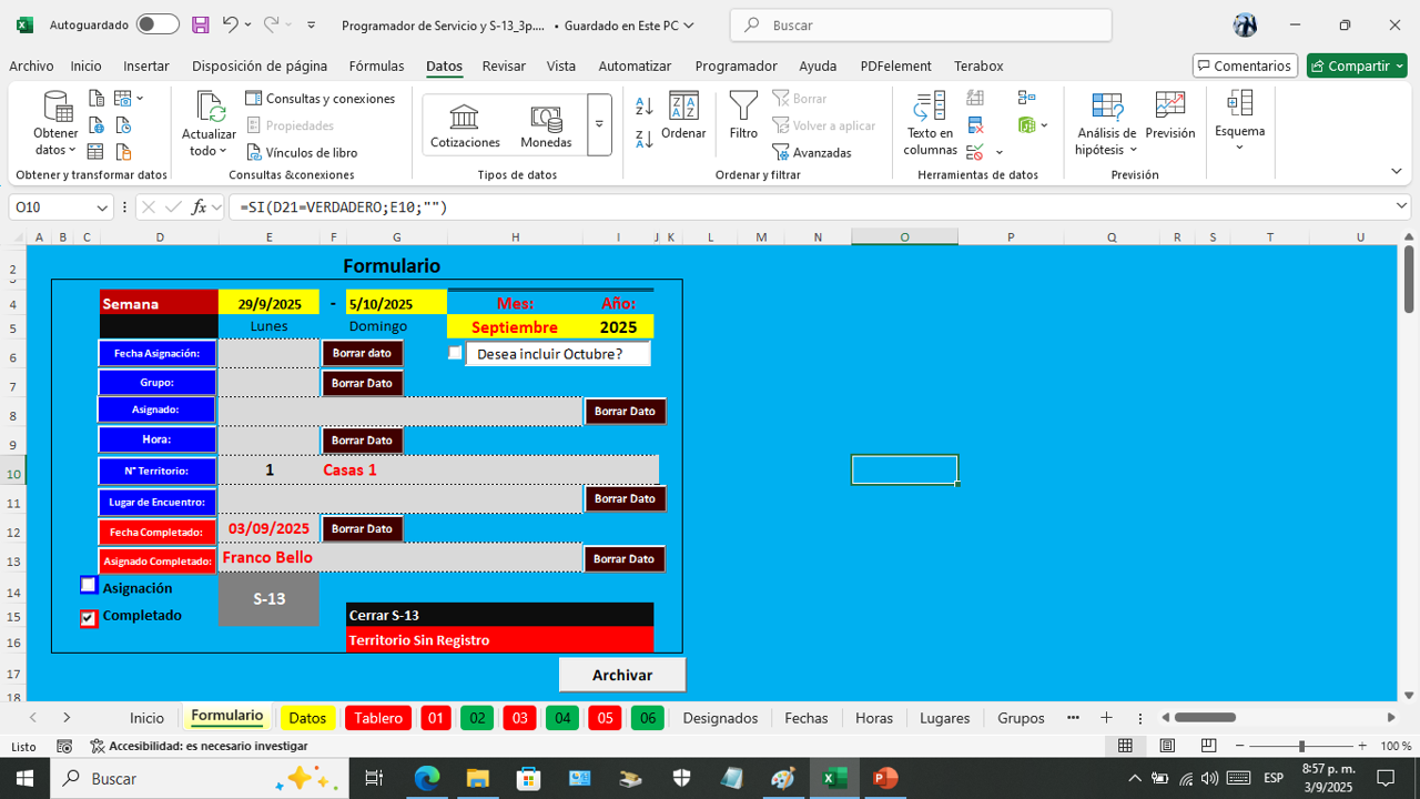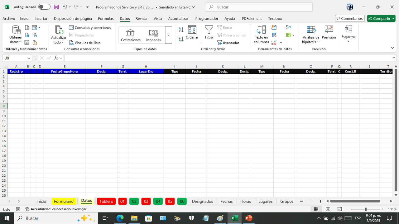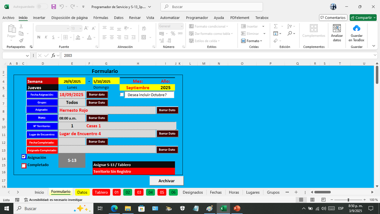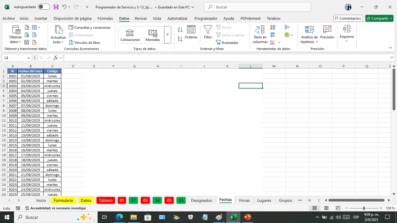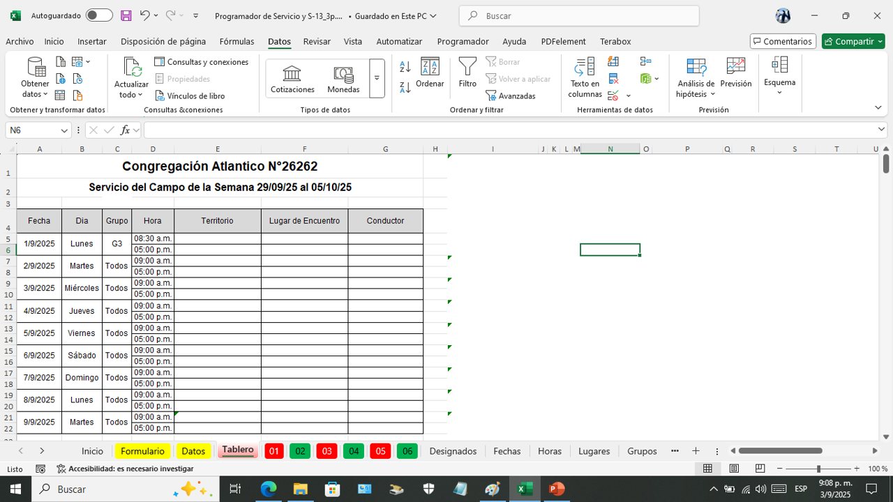Esta es la hoja donde vanos a programar el servicio del campo por semana.