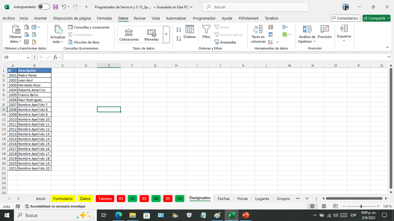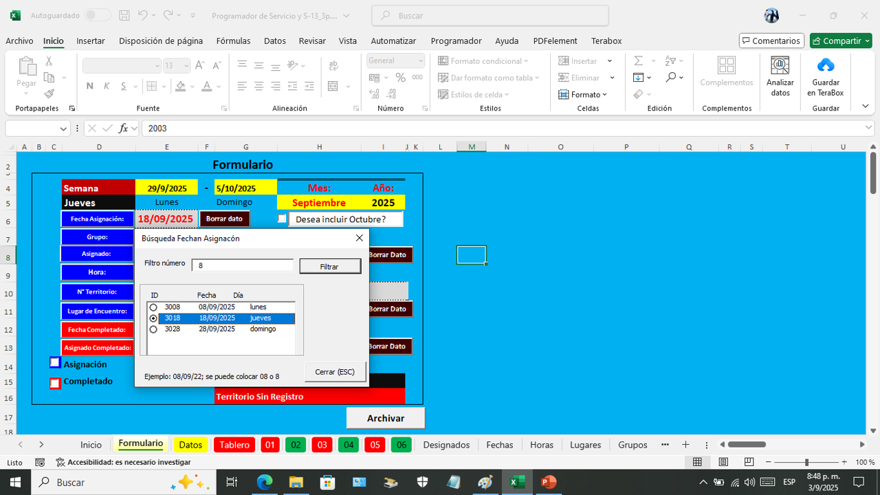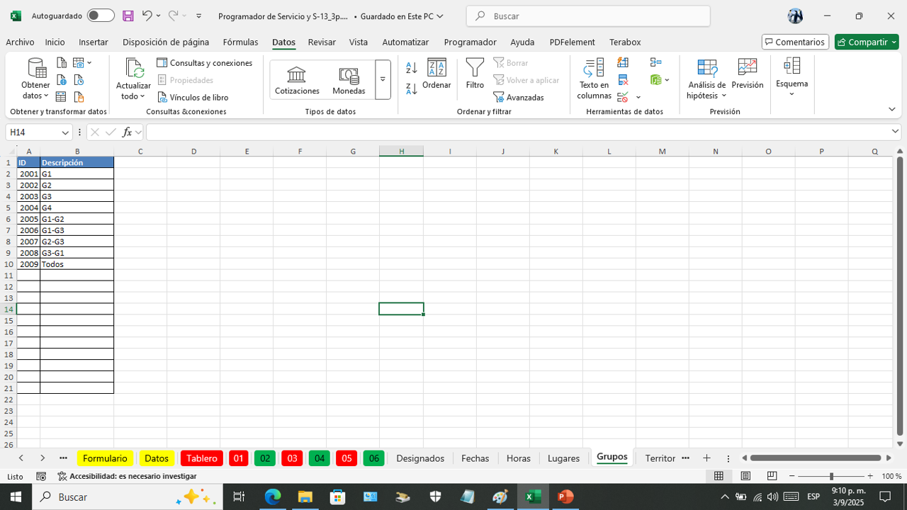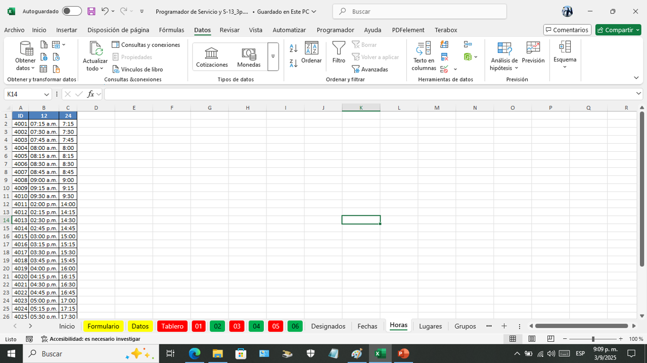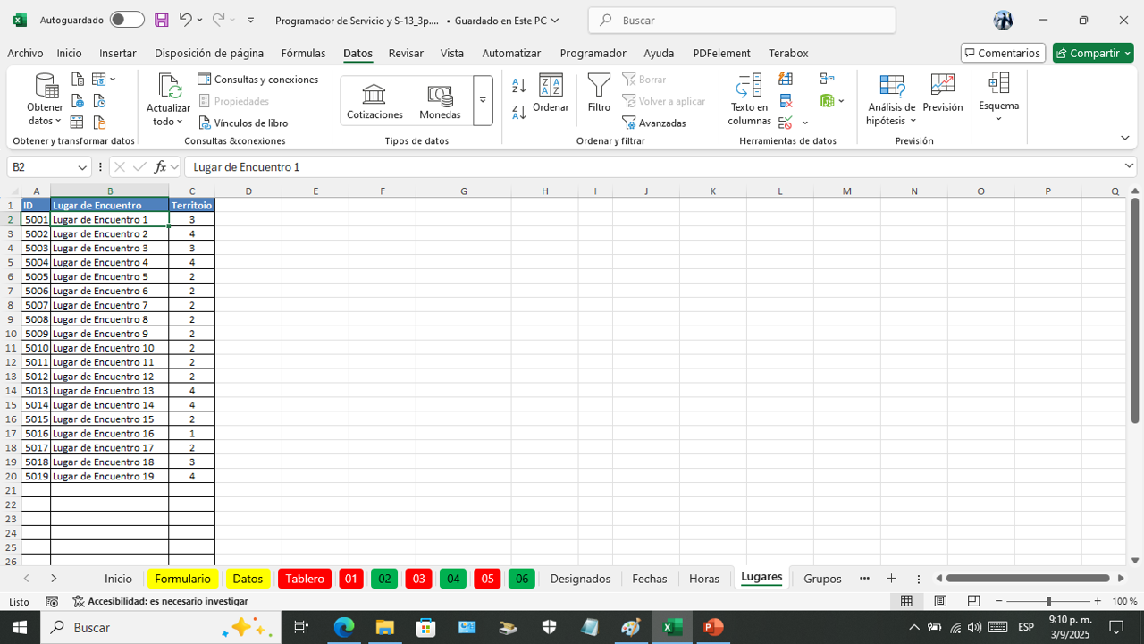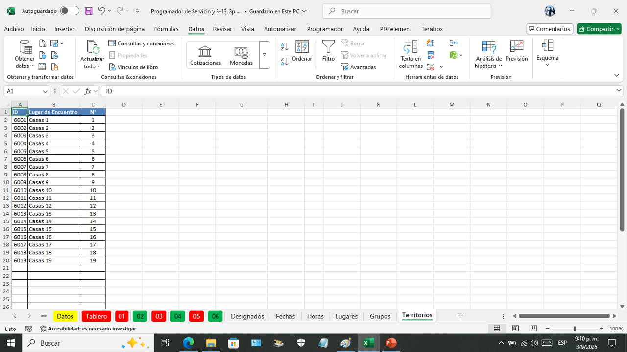 Esta es la hoja donde vanos a programar el servicio del campo por semana.