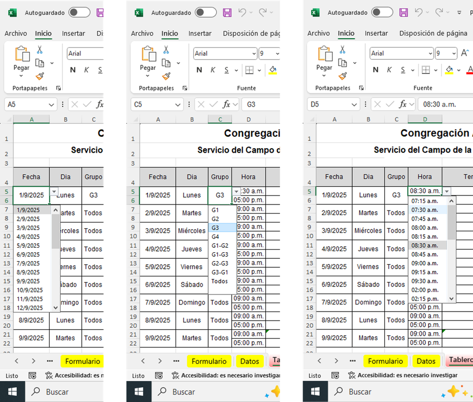 Para mayor comodidad, todas las celdas tienen lista desplegable